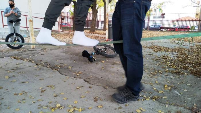 Un grupo de 9 jóvenes del barrio estuvieron iniciándose en el mundo de la Slack Line (Cuerda floja) y en el del monociclo; para finalizar con un taller en el que pudieron fabricar sus propias pelotas de malabares.