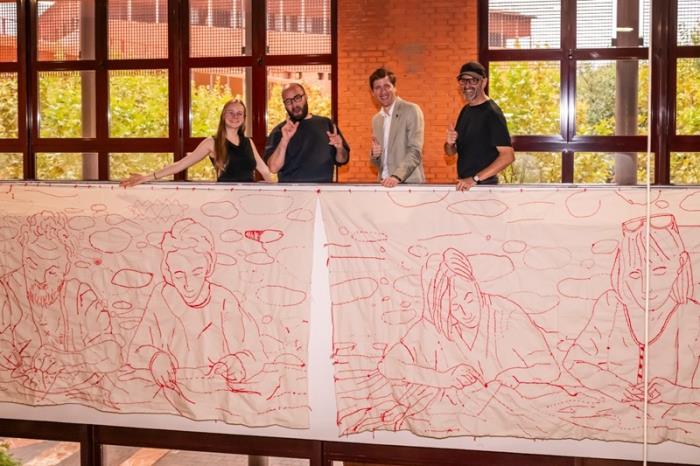 _, este martes día 21 de octubre con un encuentro entre todas las personas participantes y las entidades organizadoras. El Hall del Teatro de la UC3M de Leganés, es desde hoy el espacio de exposición de la obra colectiva "Bordada" por 115 personas que de manera voluntaria vinieron a tejer los días 14, 15, 16 y 21, en la plaza de España y patio Central de la UC3M. Con la colaboración de los colectivos del proyecto "Leganés por el Equilibrio Emocional" y bajo la propuesta del artista Belga Stephan Goldrajch. Gracias